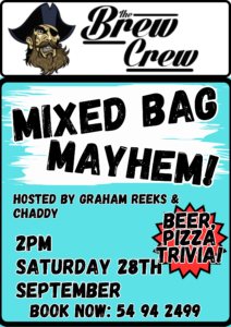 Brew Crew is back Saturday 28th of September with a mixed bag of alcoholic goodness. with 8 beers pizza and Trivia its a bargin for $40.