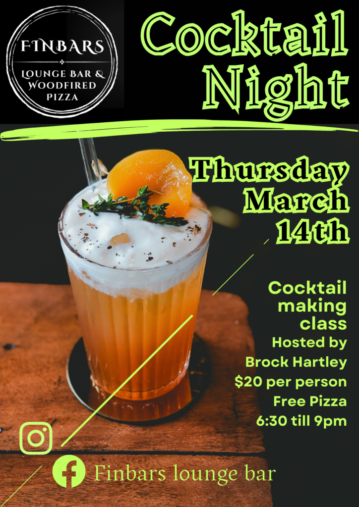 Finbars will be hosting a cocktail making class hosted bt Brock Hartley. we will be looking at the basics of coctail making and tasting a few along the way. $20 per person